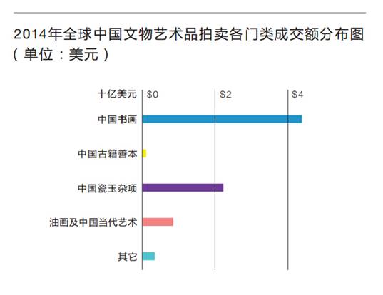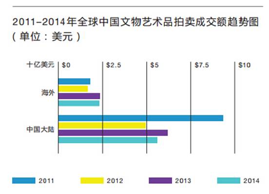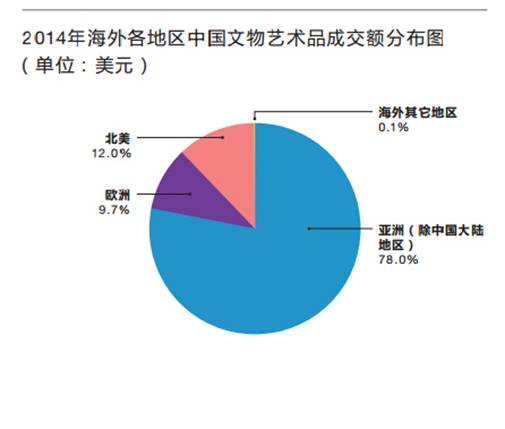 2014年全球中國(guó)文物藝術(shù)品拍賣市場(chǎng)再度下行 成交率創(chuàng)五年來(lái)新低 ——北美取代歐洲,躍居海外中國(guó)文物藝術(shù)品拍賣第二大市場(chǎng),僅次于亞洲