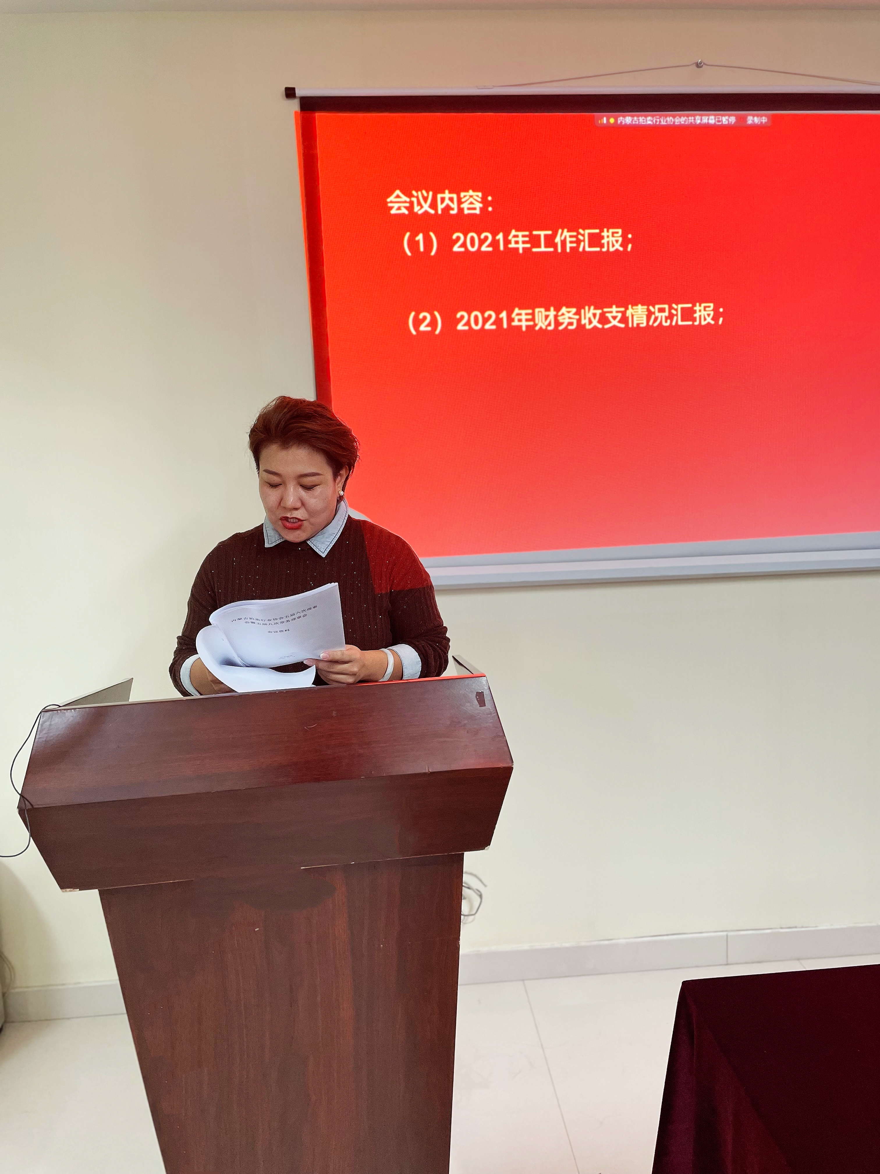 會議第二項,娜晴秘書長匯報了2021年全年的財務(wù)收支情況,并感謝大家一直以來對協(xié)會秘書處工作的支持和幫助,協(xié)會一直都是以會員單位服務(wù)為宗旨,充分發(fā)揮橋梁、紐帶、協(xié)調(diào)、服務(wù)的職能,為維護企業(yè)的合法利益,促進行業(yè)健康有序的發(fā)展在不斷的努力,希望今后大家可以更加積極的配合協(xié)會工作。 大會審議通過了由趙秋霞副會長就五家新入會企業(yè)的申請報告。 大會審議通過了郭素英副會長就新增常務(wù)理事單位“包頭拍賣行業(yè)協(xié)會”的申請報告。